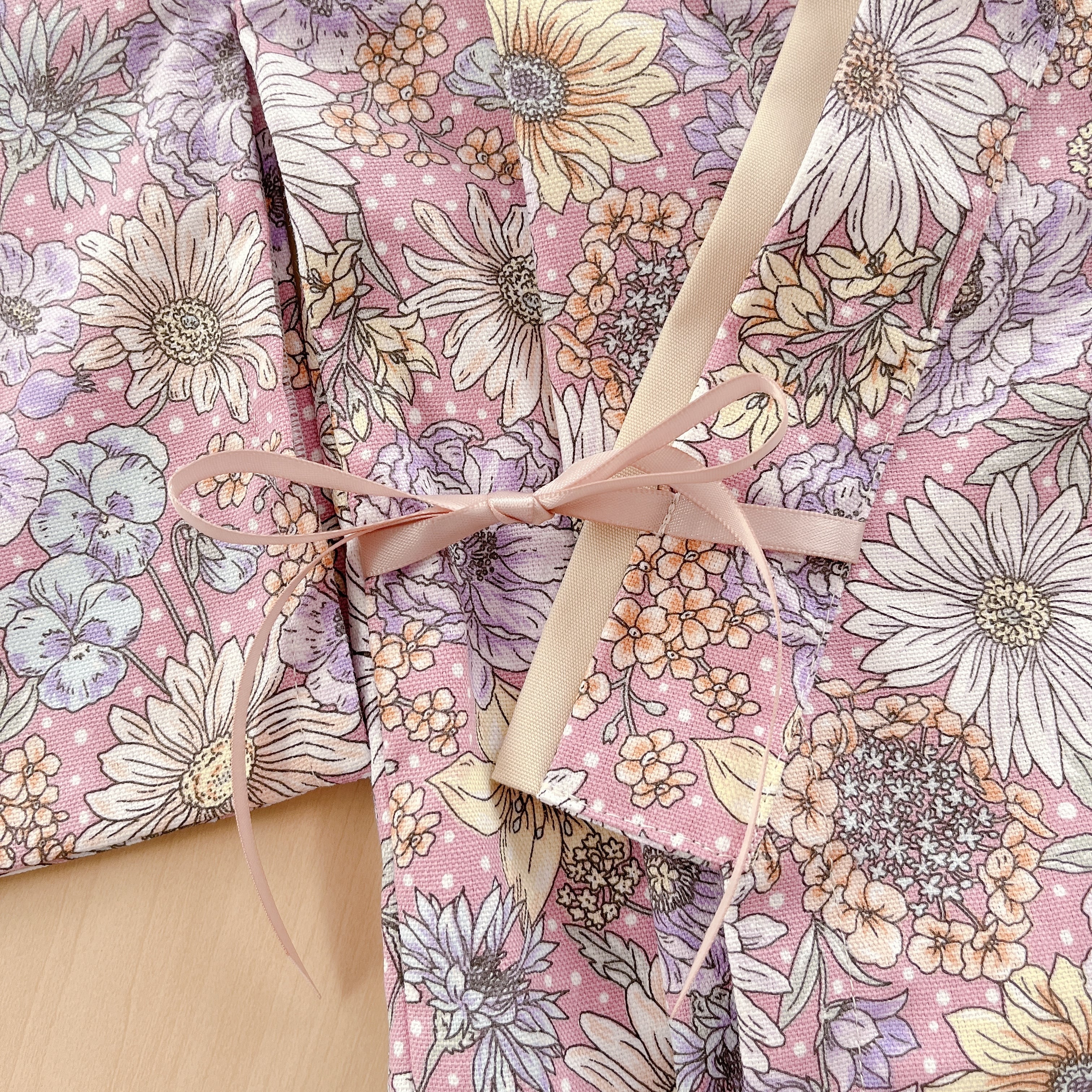 小さなドット柄にクラシカルな雰囲気のお花が可愛らしくプリントされていて女の子が着用したら