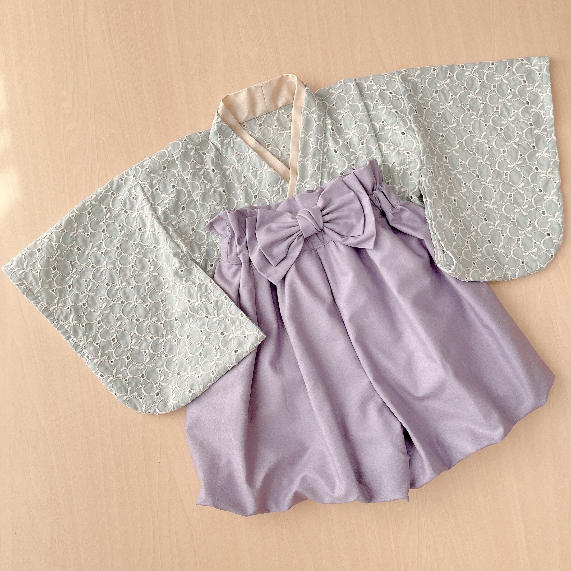 【60-70】ベビー袴 アネモネのレース生地(くすみブルー)✖︎紫の袴