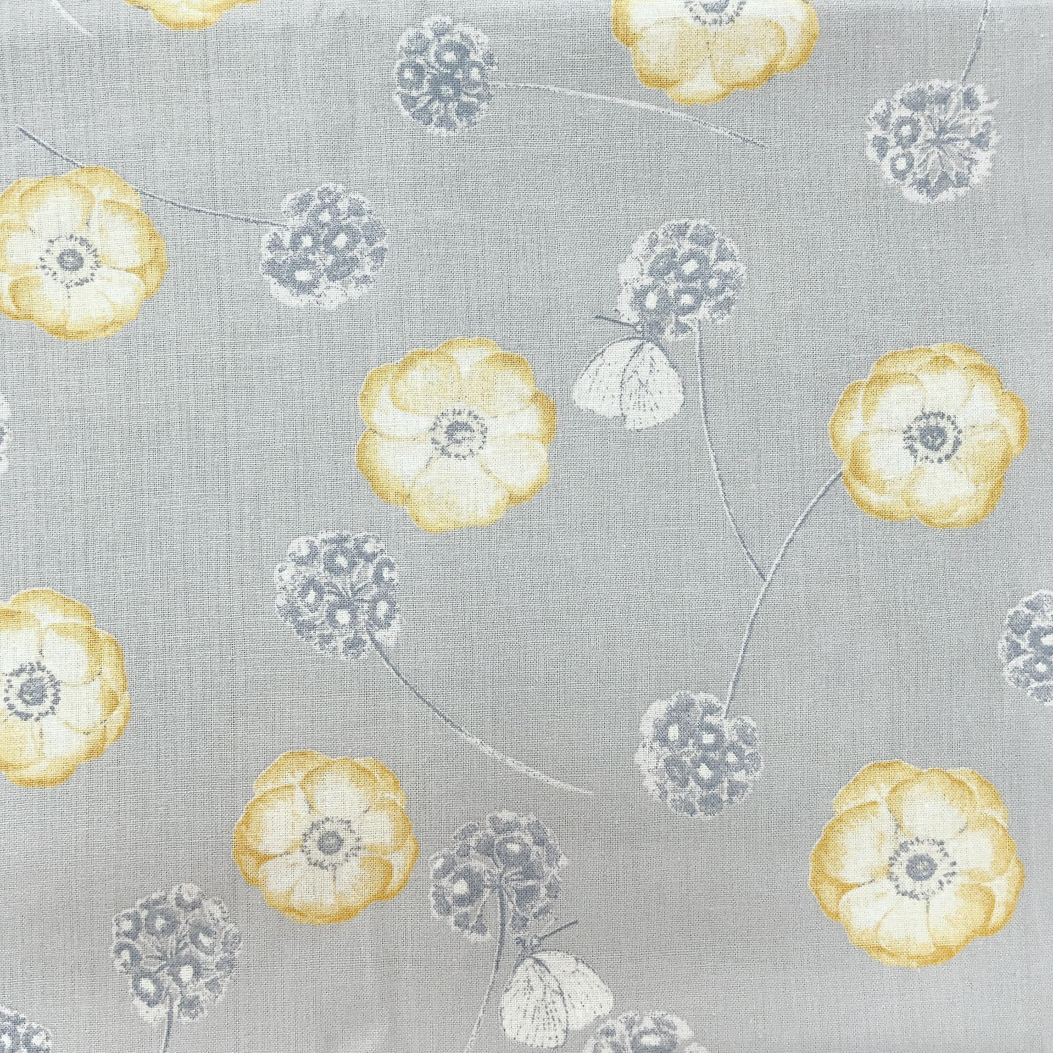 淡いグレーを基調に黄色のアネモネがプリントされたシーチング生地。