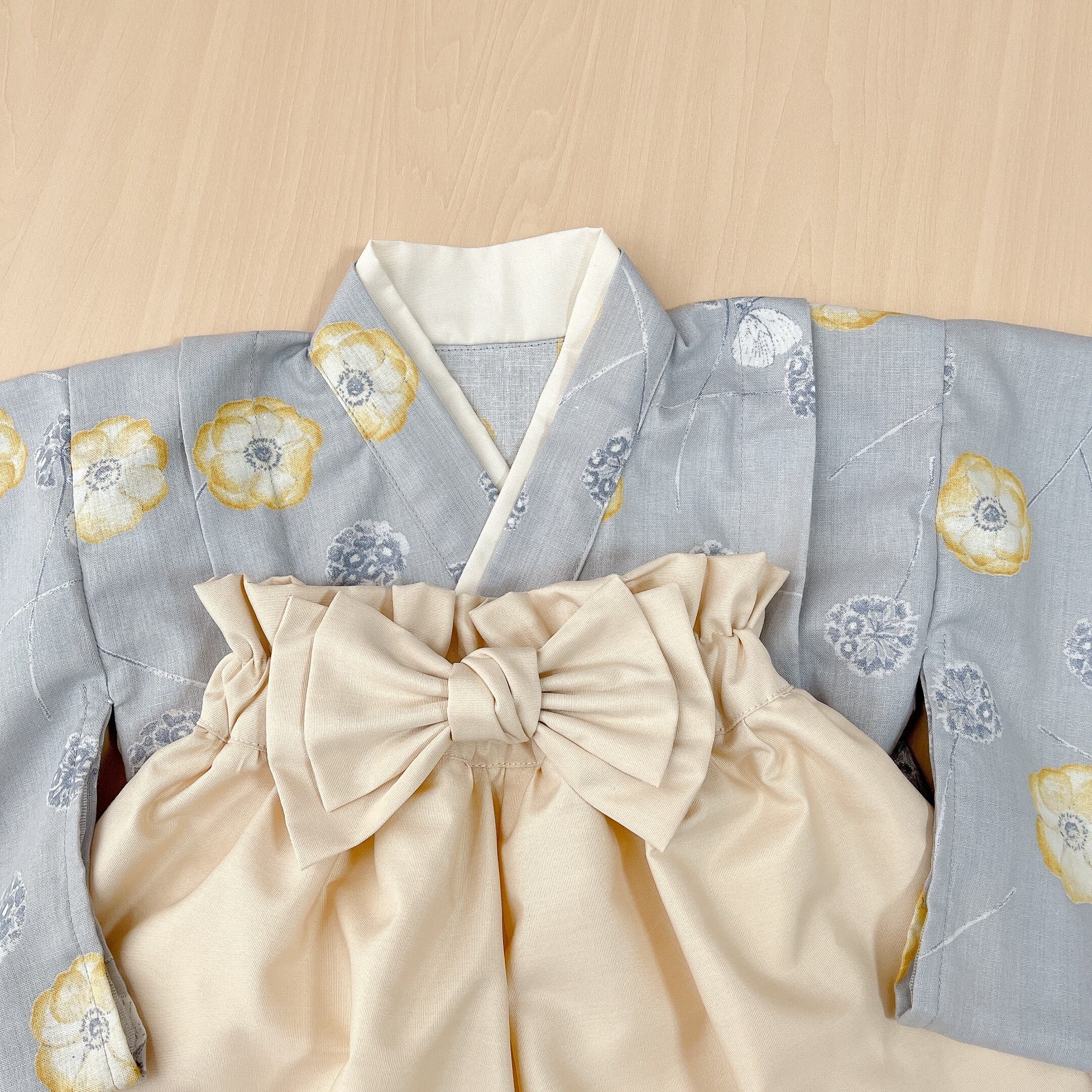 華やかな黄色のアネモネ模様がグレーの生地に映え、特別な日のお祝いや写真撮影にぴったりです。