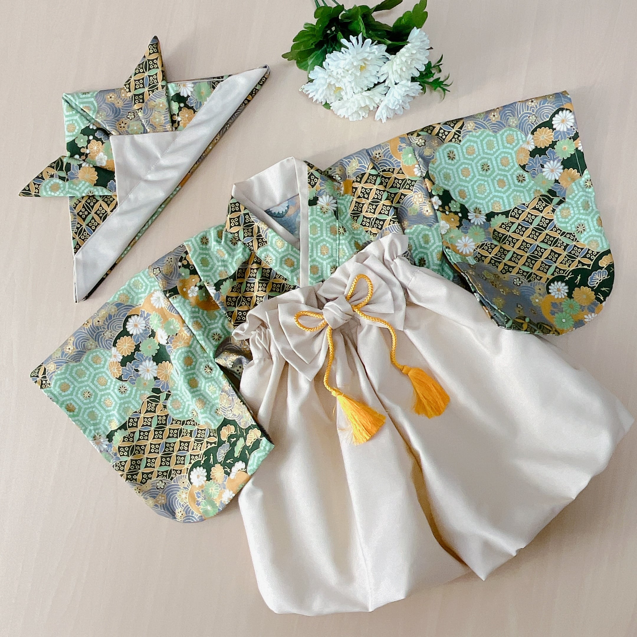 【60-70】ベビー袴 雲取り文様✖︎ベージュの袴とかぶれる布兜のセット商品